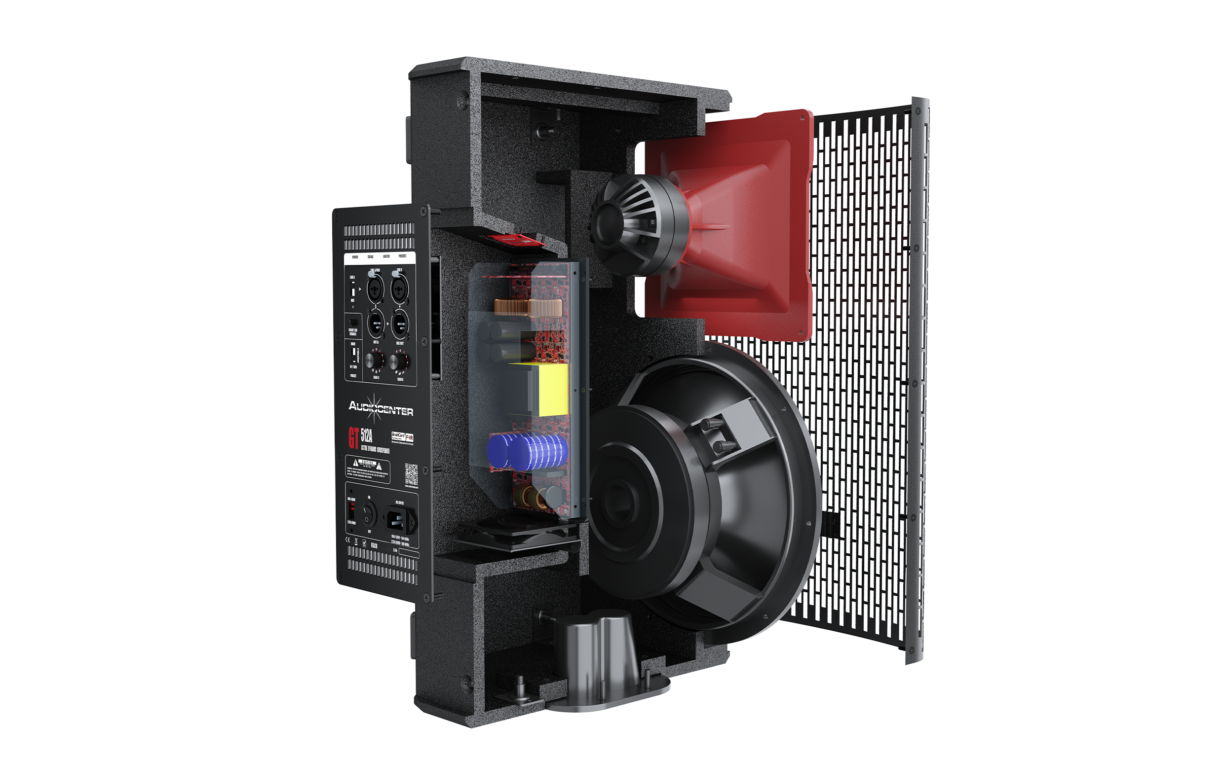 El altavoz GT508A dispone de dos entradas combo (XLR de 2 vías y jack mono 6,35). La entrada CH A puede conmutarse entre entrada de línea balanceada o entrada de micrófono. Las dos fuentes de audio pueden mezclarse internamente y emitirse como salida balanceada, transmitiendo la señal a varios altavoces para facilitar la distribución en cascada de la señal del sistema.