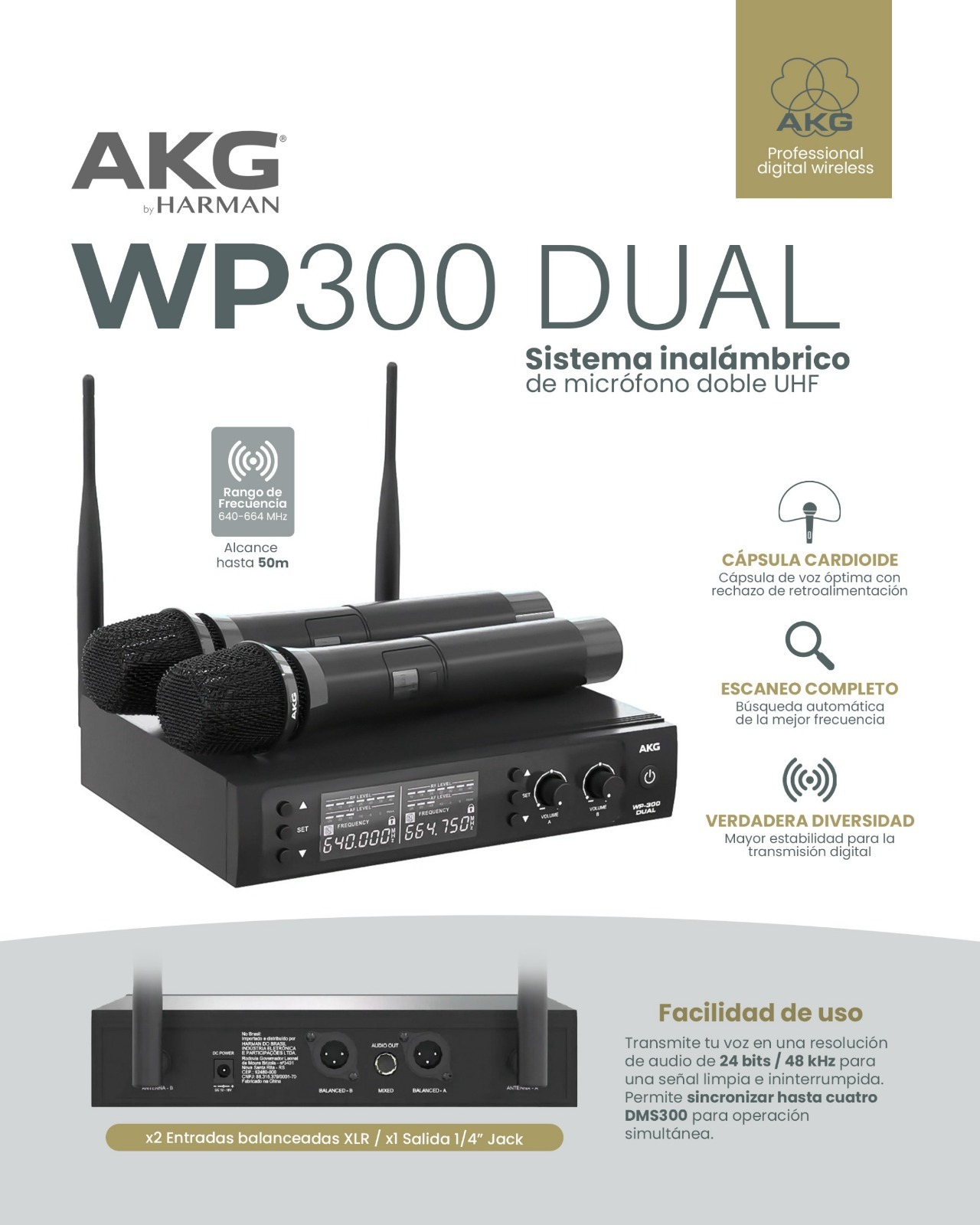 El AKG WP-300 DUAL es un sistema de micrófono inalámbrico profesional fácil de configurar, con transmisión digital en UHF, receptor con antenas externas desmontables para un mejor rendimiento, pantalla para supervisar los niveles de señal, frecuencia y ajustes de programación, salida de señal de audio balanceada o no balanceada. Ajuste automático multicanal que permite que hasta 4 sistemas funcionen simultáneamente dentro de la misma banda de frecuencia.