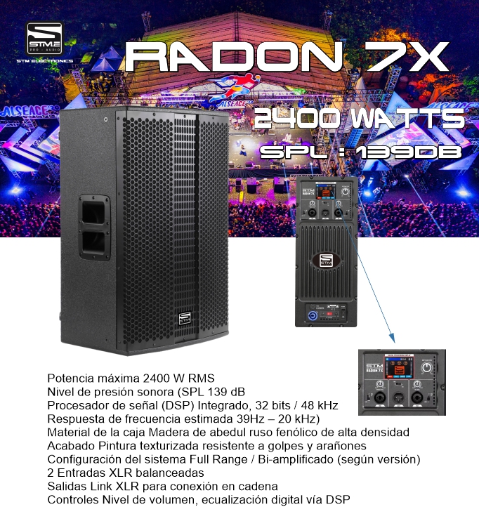 El parlante activo RADON 7X combina potencia, tecnología DSP y confiabilidad, siendo una excelente opción para usuarios exigentes.