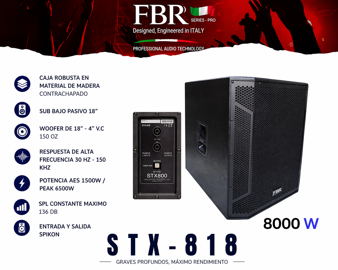 El subwoofer pasivo FBR 6500W STX-818 es una solución confiable para quienes buscan potencia, durabilidad y calidad en un solo equipo.