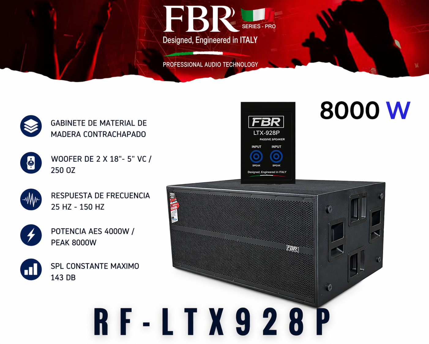 El subwoofer pasivo FBR 8000W RF-LTX928P es la elección ideal para DJs, conciertos, discotecas y eventos que requieren graves extremos y máxima potencia.